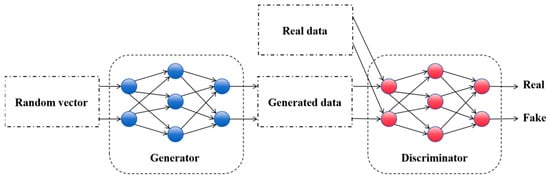 Data generation is an important technique in machine learning, especially when real data are scarce or privacy is restricted. Common data generation methods include random data generation, synthetic data generation, variational self-encoders, diffusion models, and generative adversarial networks. Among them, GAN is one of the most innovative and cutting-edge techniques in machine learning in recent years; it learns complex data distributions to generate high-quality synthetic data by constructing an adversarial network consisting of generators and discriminators to play with each other, and its structure is shown in Figure 6.