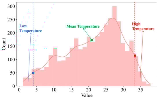 Without considering the influence of the defects of the power prediction model itself, the abnormal prediction results are usually caused by external meteorological factors, such as the icing condition of wind farm fan blades under the influence of winter cold waves, which often leads to the power prediction results being far away from the actual power, resulting in large prediction errors. Therefore, time points with large power prediction errors in the dataset can be extracted. Assuming that the sensitive weather factor data corresponding to these time points meet the normal distribution, the mean value and standard deviation are calculated, and then the data points that deviate from the mean value by 1–2 standard deviations are defined as the threshold of meteorological factors with high influence on the weather process of new energy. The time point corresponding to the meteorological data above the threshold is defined as the time point at which the new energy high-impact weather process occurs.