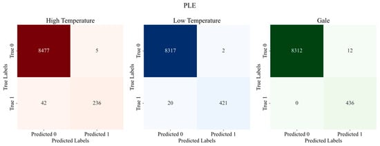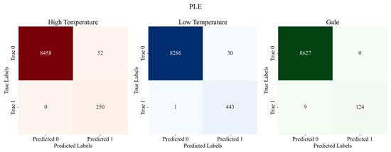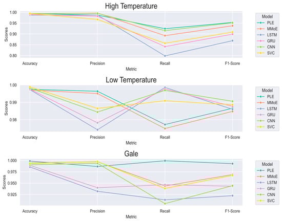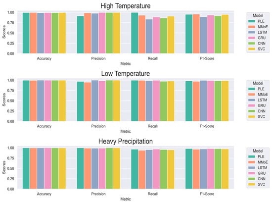 Combined with the figure and tables, it can be seen that for hot-weather classification, there is not much difference in the accuracy rate. In the precision rate, PLE is slightly lower than the other models, but there is a large improvement in the recall rate, with a maximum improvement of 16.33%, and after the comprehensive consideration by the F1-score, it can be seen that PLE is better, with a maximum improvement of 5.92%. For cold-weather classification, PLE has relatively poor metrics but higher recall than the other models, with a maximum improvement of 2.53%. As for the classification of heavy-precipitation weather, PLE outperforms other models in all indicators. Compared with the MMoE model, although the accuracy, precision, and F1 scores are slightly lower in hot weather, there is a significant improvement in recall, and it also shows more significant advantages in the other two extreme weather types.