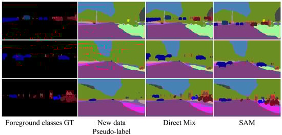 In order to enhance memory efficiency, we propose a Spatial–Adaptive replaying method for Foreground objects (SAF). After training on the old data, SAF solely stores the pixels of the foreground class in the sample and the spatial information related to the distribution of foreground-class objects. We argue that foreground-class pixels contain more crucial information than background-class pixels, despite comprising a small fraction of the total number of pixels. Therefore, SAF does not store background-class pixels. In the case of the Cityscapes dataset [], SAF reduces the memory occupation by more than 90% compared to the method of storing the original image. The goal of storing spatial information is to provide spatial constraints for replay, which helps the model better learn the contextual information of foreground classes. In the training process of new data, SAF performs Spatial–Adaptive Mix-up (SAM) with stored foreground-class objects and new samples. Figure 1 shows the mixing results of direct mixing and SAM. SAF introduces stored spatial information as prior knowledge to provide adaptive supervision for mixing, which can avoid the unreasonable spatial arrangement caused by simply mixing foreground-class objects directly with new samples, thereby preventing deep models from struggling to understand contextual information.