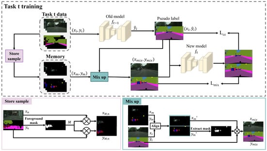 Deep neural networks have found extensive applications across various domains, such as automated control systems [] and autonomous driving [,]. Neural network-based semantic segmentation is a fundamental technology for environment perception in autonomous driving, enabling vehicles to make safer and smarter decisions through the pixel-level classification of objects in road scenes. With the development of deep learning [,,], semantic segmentation has made remarkable progress as a challenging task in computer vision. A common assumption of most semantic segmentation frameworks is that the dataset is static. In realistic scenarios, it is difficult to create a dataset at the beginning that accounts for the constantly changing driving environment. The deep models need to start with a limited scope and gradually increase over time. Retraining the model requires saving all data and is time-consuming. A naive solution is to fine-tune the model using new data. However, deep models tend to forget previously acquired knowledge, leading to a severe performance drop in previously learned tasks, a phenomenon known as ‘catastrophic forgetting’ [].