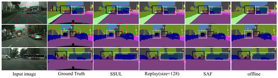 We further present qualitative results of the 13-6 incremental setting on Cityscapes in Figure 3. It can be observed that SAF performs well on certain foreground classes (e.g., bus and truck), as indicated by the white boxes. SAF correctly identifies a bus and a truck even when these objects are partially occluded by car-class objects, whereas SSUL and simple replay fail to distinguish them accurately. However, as shown in the black boxes, SAF struggles to recognize distant and smaller foreground objects (e.g., pole), the limitation was also observed in SSUL, simple replay, and even the offline training model.