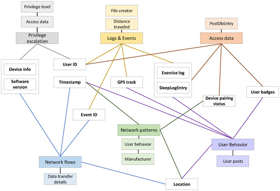 Wearable devices generate extensive biometric and sensor data, spanning both the network and application domains. GenAI uses this multimodal data, extracts the digital attributes and associates them with the corresponding source category: network traffic, network pattern, system logs and events, access, user behavior or privilege escalation. Following this process, the 5W questions are used for identification and listing of the cross-related and cross-layered digital attributes (Figure 2).