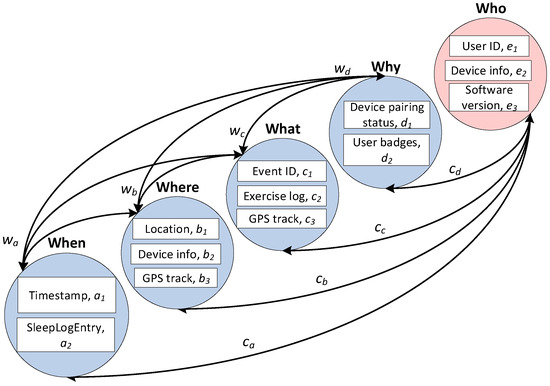 The When category emphasizes temporal alignment between wearable device data and OSINT findings. Questions in this category aim to identify the timeline of events reported in OSINT sources and correlate them with timestamps, GPS activations and activity logs from wearable devices. For example, if OSINT sources report a vandalism protest at a specific time, then the framework compares this timestamp with the device’s recorded activity to validate the device’s involvement or rule out any connection. Dependencies between attributes in this category, such as timestamps, sleep log entries and their relationships with where and what, provide a structured view of the temporal patterns and their broader context.