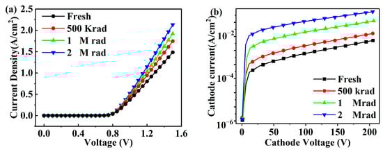 Variations in the electrical properties of the device after X-ray irradiation: (a) forward current density; (b) reverse current density.