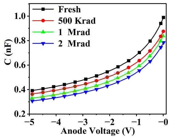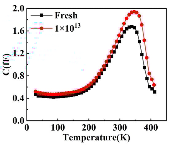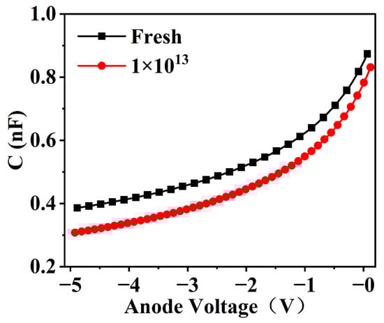 Figure 6 shows the variation in capacitance of the device before and after irradiation. Through the change in C-V characteristics, it was calculated that the carrier concentration of the device decreased from 8.328 × 1015 cm−3 to 7.734 × 1015 cm−3 after neutron irradiation. This reduction in carrier concentration is the direct cause of the decrease in the device’s forward current.