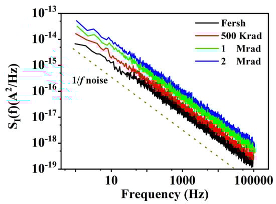 In contrast, noise is increasingly recognized as a highly sensitive method for detecting potential internal defects in devices. It offers a rapid and non-destructive testing approach [,]. When changes occur in the device’s original lattice structure, electron state density, or impurity distribution over time or under stress, noise detection exhibits more significant variations compared to other structure-sensitive parameters []. Noise in electronic devices is highly sensitive to these defects, making noise testing a common method for diagnosing and predicting defect changes []. Numerous studies have shown that 1/f noise serves as a sensitive parameter reflecting defect information in electronic components []. Therefore, when studying defects and interface state changes in the space charge region and near the oxide–semiconductor interface after irradiation, noise diagnostic techniques more effectively reflect the extent of radiation damage than traditional electrical parameters, as shown in Figure 4.