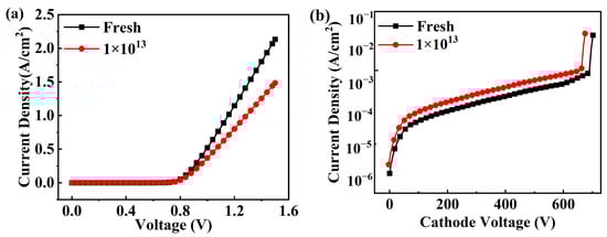 Figure 5 illustrates the changes in the device’s forward and reverse electrical performance before and after neutron irradiation; in the figure, “Fresh” represents the sample before irradiation, and the neutron irradiation fluence is 1 × 1013 n/cm2, denoted as 1 × 1013 in the figure.