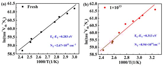 (a) Arrhenius plot of the energy levels of the device before irradiation. (b) Arrhenius plot of the energy levels of the device after irradiation.