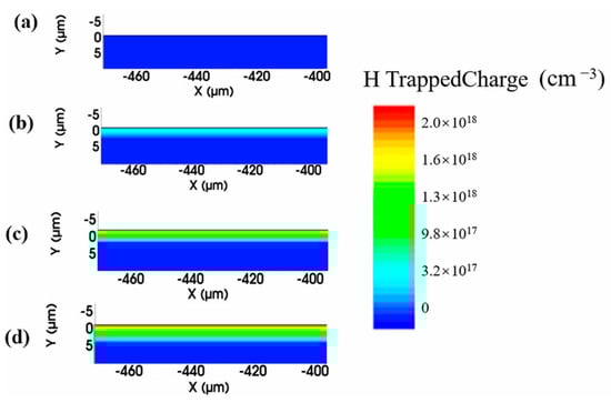 Distribution of hole-trapped charge inside the device after X-ray irradiation at different doses: (a) Fresh, (b) 500 Krad, (c) 1 Mrad, and (d) 2 Mrad.