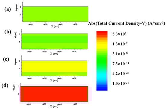 Distribution of total current density inside the device after X-ray irradiation at different doses: (a) Fresh, (b) 500 Krad, (c) 1 Mrad, and (d) 2 Mrad.