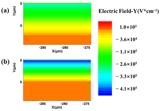 Illustration of the electric field intensity distribution within the epitaxial layer under a reverse bias of 100 V both before and after irradiation: (a) pre-irradiation and (b) post-irradiation.