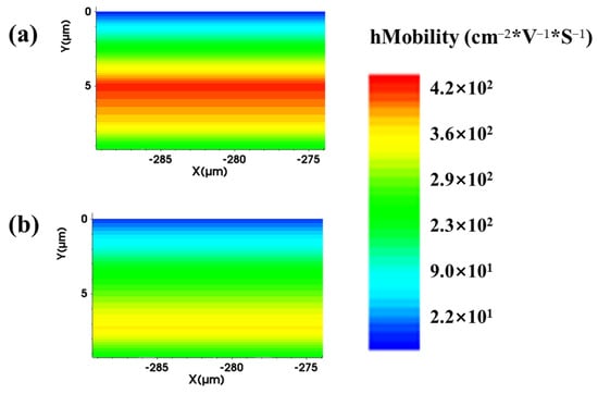 The simulation results of the change in hole mobility in the device before and after neutron irradiation: (a) before irradiation and (b) after irradiation.