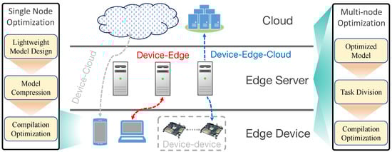 (4) Edge collaborative inference. This uses multiple computing nodes to jointly complete an inference task to improve the overall inference efficiency. Collaborative inference can be achieved through the collaboration of multiple nodes in a distributed system [43,44] or different computing cores in the same device [34,45]. It allows the task to be divided into several sub-tasks and summarizes the results after parallel processing, thereby accelerating the entire inference process. In addition, collaborative inference can also achieve fast preliminary analysis on local devices, and then more in-depth processing by the cloud, ensuring both real-time performance and accuracy. The challenge of edge collaborative inference is how to effectively divide tasks and manage communications between nodes to ensure the balance of task allocation and the efficiency of information interaction. In autonomous driving and smart cockpit applications, models can be deployed on multiple local devices for real-time image processing (such as pedestrian detection). Larger models can also be deployed locally and on edge devices for collaborative processing (such as cockpit voice interaction).