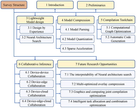 In order to improve the real-time performance of model inference when edge hardware resources are limited, we must fully consider the balance between model structure characteristics and edge hardware resource characteristics to meet the challenges of the big model era. In summary, the rest of this paper is organized as follows (as shown in Figure 2). In Section 3, we classify experience-based model design and neural network search in lightweight model design, respectively. In Section 4, we summarize three common methods (model pruning, model quantization, and sparse acceleration) in model compression. Then, we classify typical compilation optimization techniques (computational graph optimizations and automatic code generation) in Section 5. In Section 6, we summarize four collaborative inference scenarios related to EI. Finally, we highlight some future research opportunities in Section 7 and conclude the paper in Section 8.