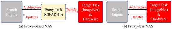 NAS is a search technique that automatically designs optimal neural network architectures using a search algorithm. Automated exploration of optimal neural network architectures not only reduces labor costs but may also uncover novel model structures. NAS can generally be divided into two categories: proxy-based (as shown in Figure 3a) and proxyless (as shown in Figure 3b). Proxy-based NAS relies on proxy models to approximate the performance of the architecture, whereas proxyless NAS performs architecture search and evaluation directly on the target embedded hardware. Both proxy-based and proxyless NAS have their own advantages and disadvantages. We summarize related works on these methods in Table 2.