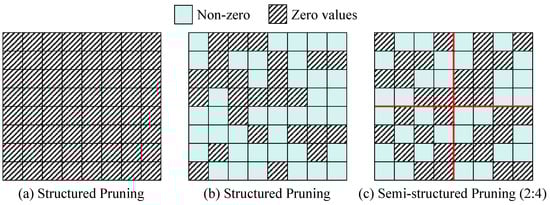 Semi-structured pruning, also referred to as pattern pruning, addresses the limitations of both structured and unstructured pruning by striking a balance between them. Building on structured pruning frameworks, this approach performs fine-grained parameter optimization while satisfying predefined constraints. Unlike unstructured pruning, which removes individual weights, semi-structured pruning targets weight parameters that follow a specific structural pattern. For example, in 2:4 pruning [82], two non-zero values are retained for every four adjacent convolutional kernel parameters (as shown in Figure 4c). By leveraging analytical techniques such as module-activity-based analysis [77,78] and feature map redundancy analysis [73,74], semi-structured pruning identifies and systematically removes redundant structural modules within weight matrices. This methodology effectively balances the compression ratio and computational efficiency while maintaining acceptable performance levels.