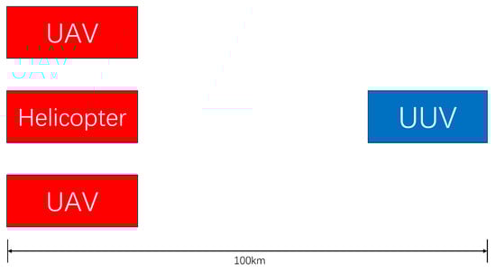 The simulation environment is configured as a maritime domain, as Figure 1 shows. The search team consists of two UAVs and one helicopter, tasked with detecting and localizing a single UUV operating within the area.