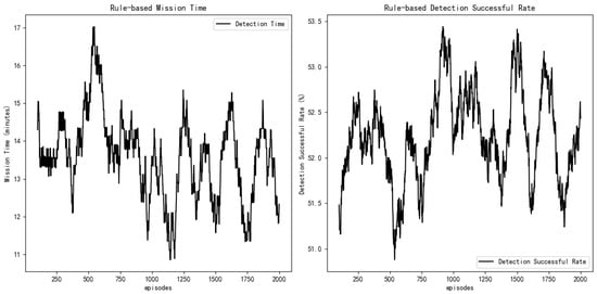 Figure 2 shows how the task completion time and detection success rate of the drone change with the number of training steps under the rule-based method. The mission execution time represents the total time required for the UAV to complete the search mission, which is usually measured from the start of the execution to the successful completion of the mission. The detection success rate indicates the ratio of the number of episodes that complete the search task to the total number of training episodes. As can be seen from the figure, the rule-based method, while straightforward and computationally efficient, exhibits limitations in flexibility and adaptability, resulting in relatively higher mission completion times and suboptimal performance in dynamic environments.