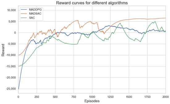 Figure 4 illustrates the reward change trend of three reinforcement learning algorithms (MADDPG, MADSAC, SAC) during the training process. It can be seen from the figure that MADSAC is better than MADDPG and SAC in terms of convergence speed and the final reward value. MADSAC converges in 1350 episodes, while MADDPG needs 1650 episodes and falls into a local optimum. SAC still has large fluctuations in the later stage. Compared with MADDPG, the algorithm proposed in this paper adopts maximum entropy to increase the robustness of the algorithm and uses a dual evaluation network to alleviate the overestimation problem. Compared with SAC, the algorithm proposed in this paper adopts the CTDE training framework, which can obtain the information of all intelligent agents during the training stag and, at the same time, constructs a neural network that can adaptively adjust the coefficient size according to the randomness of the strategy, effectively balancing the exploration and stability of the strategy.