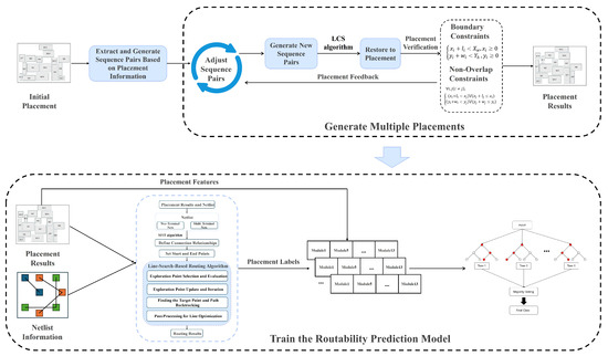For each placement, we employ a gridless fast routing method based on line exploration, combined with the netlist information of the corresponding placement and routing design case, to perform routing operations on the generated placement result data. The routing connectivity ratio from the routing results is used to label the placement samples. Using a threshold , placement results with a routing connectivity ratio below the threshold are considered to be poor placements (0), while those above the threshold are defined as good placements (1). Finally, based on the routing connectivity ratio from the corresponding routing results, the generated placement sample data are categorized into two classes, transforming the routability prediction problem into a binary classification problem. To train the routability prediction model, we first randomly perturb the sequence pairs of the placements to generate new placement samples. Then, features are extracted from these placement samples, and each sample is assigned a corresponding routing connectivity ratio label. The random forest algorithm is used to train these labeled placement samples to build the routability prediction model. The training flowchart is shown in Figure 3.