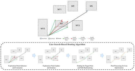 Our routing process consists of four steps: exploration point selection and evaluation, exploration point update and iteration, finding the endpoint/path backtracking, and post-processing of the line type. The routing process is illustrated in Figure 4. To complete the routing of a placement using the line-search algorithm, we first determine the start and end points of the connections based on the given netlist data and then use the line-search algorithm to connect the start and end points.
