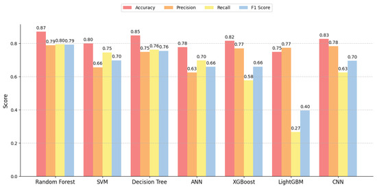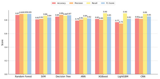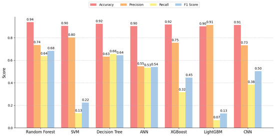 To evaluate the performance of the routability prediction model, this study employs the random forest algorithm [20] as the baseline model and compares it with other commonly used machine learning algorithms, including SVM [21], decision trees [22], ANN [23], XGBoost [24], LightGBM [25], and CNN [26]. For different classification threshold strategies, we evaluate the performance of each model on the same dataset using metrics such as accuracy, precision, recall, and F1 score. Figure 8, Figure 9 and Figure 10 show the comparison of prediction performance among different models at different thresholds. At the same time, we also compared the time required for each model to predict a single layout with the time required for routing a single layout, as shown in Table 4.