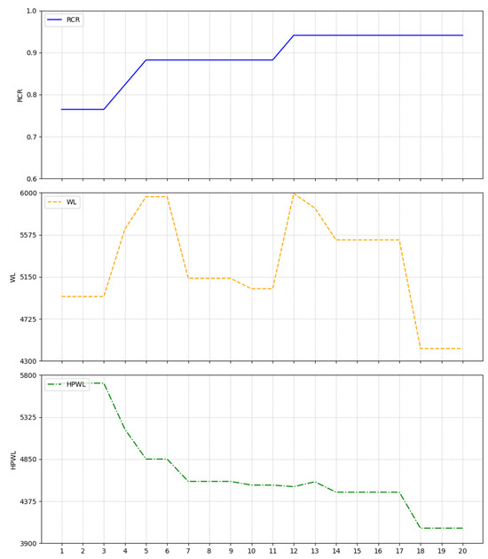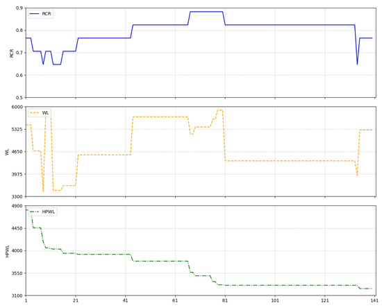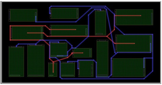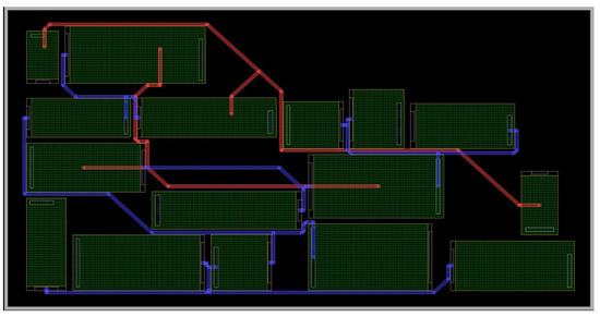 Figure 11 shows the routing result of the initial layout for case 10054, where red and blue lines represent different routing layers. The achieved routing connectivity ratio is 0.706, with a wirelength of 6239.297. Figure 12 presents the result of placement and routing optimization using the simulated annealing algorithm with HPWL as the optimization objective. After 140 adjustments, the routing connectivity ratio increased to 0.765, and the wirelength was reduced to 5300.374. Figure 13 displays the optimized layout achieved by the proposed algorithm, with 20 rounds of optimization, each consisting of 7 adjustments. The routing connectivity ratio improved to 0.941, and the wirelength was shortened to 4426.264. Figure 14 illustrates the optimization process using the simulated annealing algorithm based on HPWL as the optimization objective, while Figure 15 shows the optimization process of the proposed algorithm.