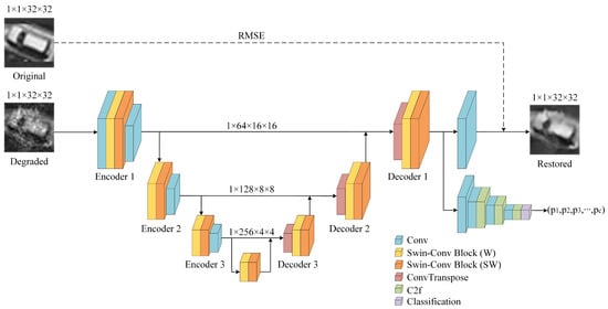 The network consists of three main components: a backbone network, a classification network, and a restoration head. As illustrated in Figure 2, the backbone network has a UNet structure with three encoder modules and three decoder modules, enhanced with newly designed Swin–Conv Blocks [37] to improve the network’s ability to capture local and global feature information.