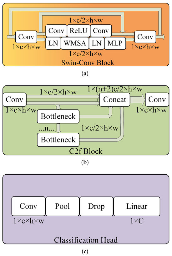 The architectures of sub-modules. In order, (a–c) illustrate the structural schematics of the Swin–Conv Block, C2f Block, and Classification Head.