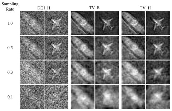 Due to atmospheric turbulence, the details and textures of the reconstructed objects are generally severely deteriorated. Compared to the DGI method, the reconstructions using the TV method have better quality no matter whether it is Hadamard or random patterns for sampling. Between Hadamard and random patterns, when the TV method is used, the former present better reconstruction quality. Meanwhile, the image quality of each reconstruction scheme deteriorates rapidly as the sampling rate decreases, particularly for the DGI algorithm.