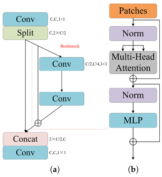 Among the seven networks, the first four are based on CNN architectures. The YOLOv8 object classification network adopts the idea of Cross-Stage Partial Network (CSPNet), which splits the input into two parts within the backbone network [45]. One part is fed into the standard bottleneck structure, while the other remains unchanged and is directly concatenated with the bottleneck output along the channel dimension, as shown in Figure 5a. This structure not only reduces the parameter count and memory consumption, but also maintains or improves accuracy. As a representative lightweight network, MobileNetV3 decomposes the standard convolution into depth-wise convolution and point-wise convolution, effectively reducing computational cost and model size. Furthermore, ConvNeXt maintains the inherent simplicity and computational efficiency of convolutional networks while narrowing the performance gap with models based on transformer. Finally, the EffNetV2’s compound scaling method optimally balances network depth, width, and resolution, thereby achieving higher efficiency with fewer computational resources. It offers an optimal balance of precision and speed, which makes it particularly suitable for large-scale image recognition tasks.