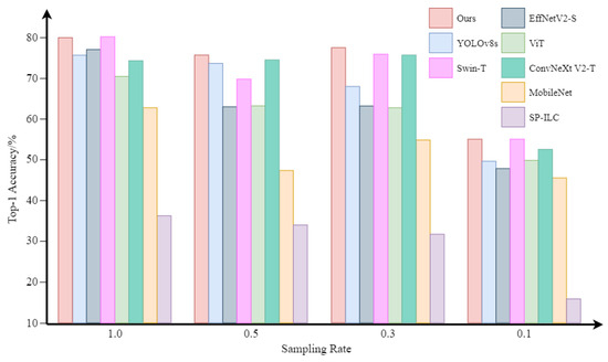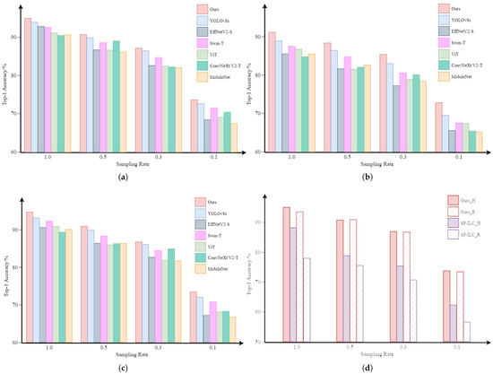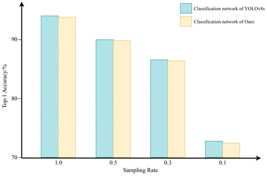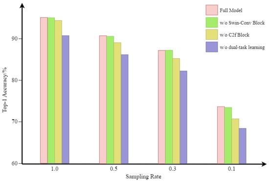 To ensure the feasibility of LR-DTSPNet, we performed component-wise ablation analyses through systematic removal of critical modules, generating three controlled architectural variants for comparative evaluation. Among them, “w/o Swin–Conv Block” removes the Swin–Conv Block, “w/o C2f Block” removes the C2f Block, and “w/o dualtask learning” retains only the object classification task. The results of the ablation study are shown in Figure 9. The findings indicate that the elimination of certain components results in different levels of performance decline. The most significant performance drop occurs when dual-task learning is removed, with a maximal accuracy decrease of 5.24% and an average decrease of 4.77%. The second most significant impact is observed when the C2f Block is removed, resulting in a maximal accuracy decrease of 2.94% and an average decrease of 1.82%. Still in terms of classification accuracy, removal of the Swin–Conv Block has the least impact, with a maximum accuracy decrease of 0.21% and an average decrease of 0.085%.