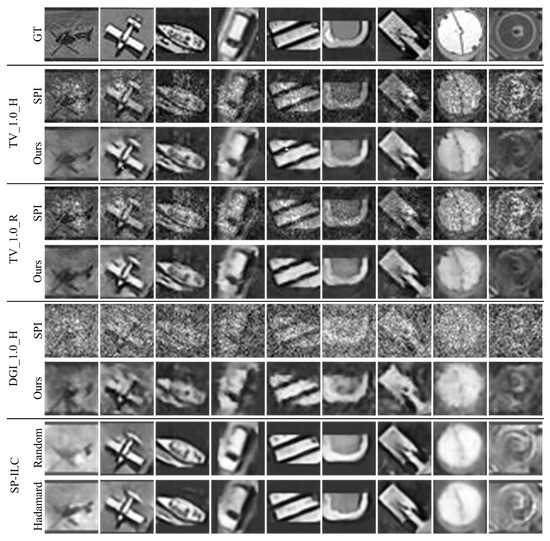To verify the effectiveness of our method, we built various datasets based on different sampling rates and reconstruction schemes in SPI, as shown in Figure 4. The original objects for the experiments were all cropped from the DOTA remote sensing dataset [39]. Compared to other remote sensing datasets, the DOTA dataset offers a larger number of instances and more precise annotations, facilitating image cropping and network training. Therefore, we selected the DOTA dataset for our study. We cropped the images according to the instance bounding boxes provided in DOTA and resized them to a consistent dimension, resulting in the original images for SPI. The dataset contains a total of 201,407 images. The atmospheric turbulence was simulated by adding 100 layers of turbulent phase screens. The dataset includes images of swimming pools, ships, helicopters, storage tanks, small vehicles, roundabouts, harbors, planes, and large vehicles, totaling 201,407 images. The dataset is divided into training and validation sets in a ratio of 9:1. Single-pixel sampling processes were performed using Hadamard patterns and random grayscale patterns at sampling rates of 1.0, 0.5, 0.3, and 0.1, respectively. We utilized TV and DGI algorithms to reconstruct the objects for training and testing of a network.