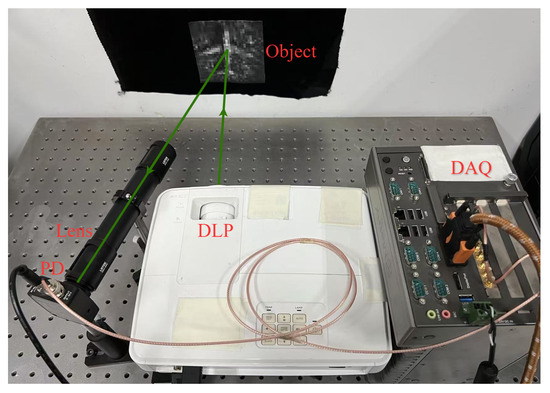 The setup of the optical experiment is shown in Figure 11. Modulation patterns are loaded onto a digital light projector (DLP) and projected onto the object. After interacting with the degraded image, the modulated light field is focused by a lens group onto a photo detector (PD, DH-GDT-D020V, Daheng optics, Beijing, China) to capture a one-dimensional bucket signal. This one-dimensional signal is then processed by a data acquisition card (DAQ, ADLINK PCIe-9814, ADLINK, Beijing, China) and stored on a computer. Since the cake-cutting Hadamard patterns exhibit excellent feature extraction capabilities, we employed these patterns as modulation patterns in the experiment. Furthermore, the sampling rates for the experiment are 100%, 50%, 30%, and 10%.