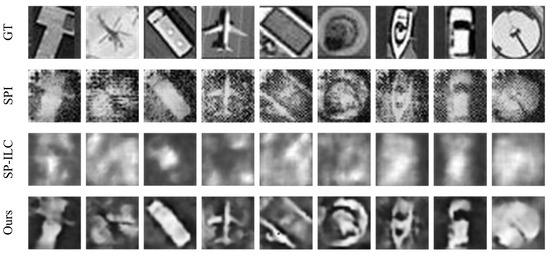 Furthermore, our network improves the quality of single-pixel images while performing classification, as illustrated in Figure 13. Compared to SPI, our network significantly improves image quality, effectively suppressing noise, enhancing object prominence, and refining image details. Additionally, compared to the reconstruction performance of SP-ILC, our restoration results are noticeably superior. The primary reason is that our simulation experiments solely included atmospheric turbulence phase screens, without additional noise, resulting in relatively ideal conditions. However, in optical experiments, the restoration quality may degrade significantly, especially for image-free classification methods using one-dimensional measurements. In contrast, image-based methods, with their twostage process, exhibit greater noise resistance and robustness in practical scenarios. For objects such as harbors, vehicles, airplanes, and ships, the background becomes cleaner after network processing, and the distinctive features of each object are more prominently highlighted, which supports improved performance in subsequent computer vision tasks. These experimental results confirm the superior performance of our proposed method in both object classification and image quality restoration tasks.