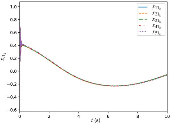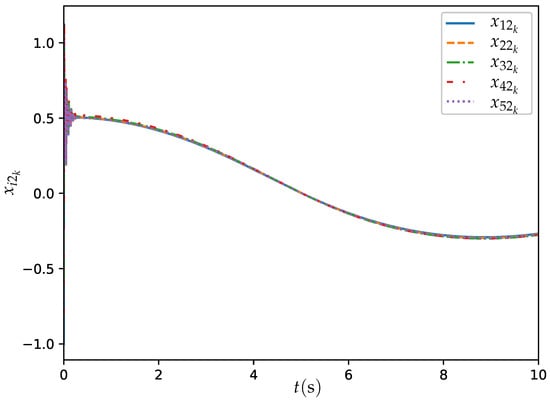 Under the dynamic topology, the agents are linked via a time-varying communication structure, where the topology switches every 1 s to a new randomly generated strongly connected undirected graph. At each switching instant, the adjacency matrix A is constructed using an Erdos–Rényi random graph model with a connection probability of 0.3 [], ensuring bidirectional information exchange between connected agents. The generation process guarantees strong connectivity by verifying that the resulting graph allows a path between any pair of agents i and j in both directions when considered as a directed graph. This dynamic, strongly connected topology ensures network adaptability and persistent consensus capability despite frequent structural changes. The experimental results are illustrated through Figure 11, Figure 12 and Figure 13.