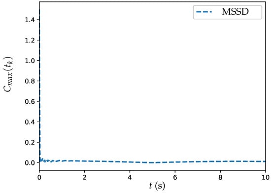 Additionally, experiments are conducted with the ET-DTZNN algorithm solving the DTDTVO problem in a large MAS with different . Figure 10 showcases a semi-log plot illustrating the MSSRE over a 10-second interval for the ET-DTZNN algorithm addressing a DTDTVO problem with 20 agents. This plot compares the results of two trials, where s is represented by the blue dashed line and s is depicted by the orange dotted line. The results show that the smaller sampling interval ( s) yields a low MSSRE of , while s exhibits periodic oscillations peaking at , driven by the time-varying objective function, confirming the theoretical MSSRE scaling of .