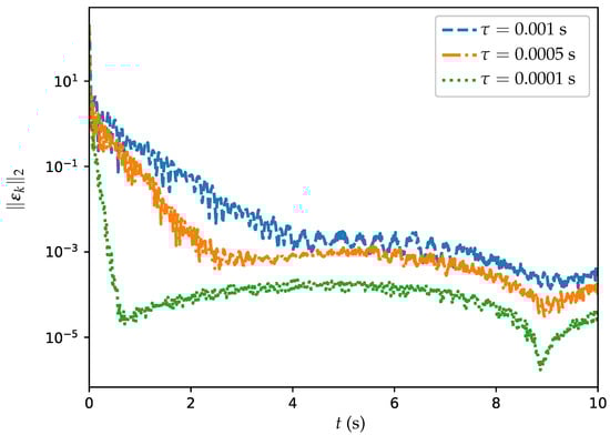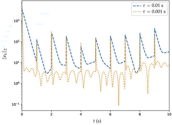 Table 4 presents the MSSREs of the PSGNN and ET-DTZNN algorithms in solving the DTDTVO problem with different values of . From Table 4, it is observed that as the value of decreases, the MSSRE values for both algorithms also decrease. Specifically, for s, the MSSRE of PSGNN algorithm is and the MSSRE of ET-DTZNN algorithm is . For s, the MSSRE of PSGNN algorithm is and the MSSRE of ET-DTZNN algorithm is . Finally, for s, the MSSRE of PSGNN algorithm is and the MSSRE of ET-DTZNN algorithm is . Overall, the ET-DTZNN algorithm consistently outperforms the PSGNN algorithm in terms of precision across all tested values. The results highlight the superior performance of the ET-DTZNN algorithm in achieving more accurate solutions compared with the PSGNN algorithm.
