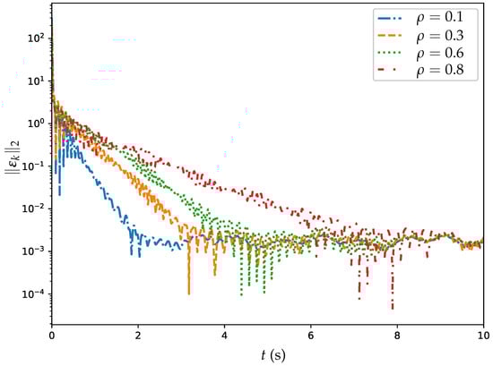 - Case 3: If , then we have . (i) When , we determine that is a decreasing function, which indicates that . (ii) When , it indicates that remains on the surface of a sphere with a radius of less than . That is, . (iii) When , we determine that is an increasing function, which indicates that the residual error tends to converge towards as time increases. That is, .