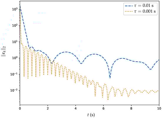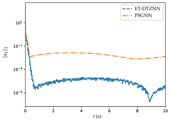 Figure 7 illustrates the trajectories of the MSSRE over time t for two different algorithms: PSGNN and ET-DTZNN. The y-axis represents on a logarithmic scale, ranging from to . The blue dashed line represents the ET-DTZNN algorithm, which shows a rapid decrease in initially, stabilizing around . This indicates that the ET-DTZNN algorithm quickly reduces the residual errors and maintains a low error level throughout the experiment. On the other hand, the orange dash–dot line represents the PSGNN algorithm, which shows a slower decrease in and stabilizes around . This indicates that the PSGNN algorithm requires more time to decrease the residual errors and sustains a higher level of error when compared to the ET-DTZNN algorithm. Overall, the ET-DTZNN algorithm presents superior performance in terms of convergence rate and accuracy compared with the PSGNN algorithm. The analysis showcases the success of the ET-DTZNN algorithm in addressing the DTDTVO problem under the configuration of and s, highlighting its efficiency and precision.