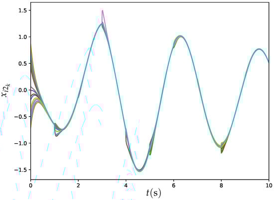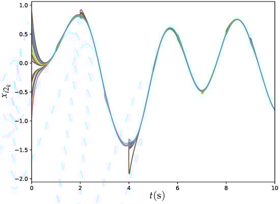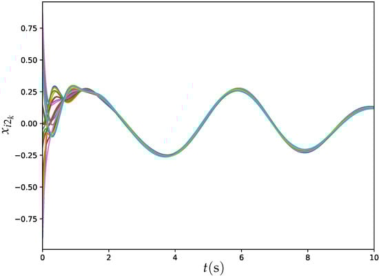 Figure 11 and Figure 12 illustrate the trajectories of and for all agents synthesized by ET-DTZNN Algorithm (22) under dynamic topology with s and . The experimental results depicted in Figure 11 and Figure 12 illustrate the effectiveness of the ET-DTZNN algorithm in achieving convergence and consensus for all agents in a large MAS under dynamic topology. The dynamic topology introduces noticeable perturbations at each switching instant (e.g., at ), manifesting as slight discontinuities or oscillations in the trajectories. These perturbations are more pronounced in the early stages when the states are farther apart but diminish as consensus is approached, indicating the robustness of the ET-DTZNN algorithm to topological changes. The impact of the dynamic topology is evident in the small, periodic deviations from smooth convergence, yet the algorithm maintains overall stability and achieves consensus, highlighting its adaptability to frequent structural changes in the communication network.