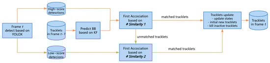 First, we apply the object detector (Det) to the current frame to obtain all detection boxes, denoted as . These detection boxes are then categorized into two sets, i.e., and , based on the threshold (). Detection boxes with scores exceeding are assigned to , while those with scores between and 0.1 are assigned to . After separating the low-score detection boxes and the high-score detection boxes from , we use a Kalman filter to predict the new locations of each track in for the current frame. The association between and is carried out in two stages as follows.