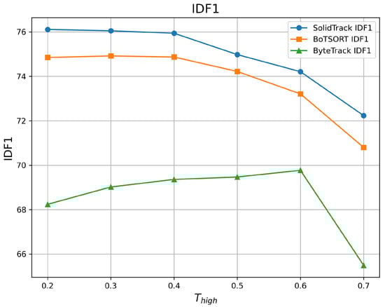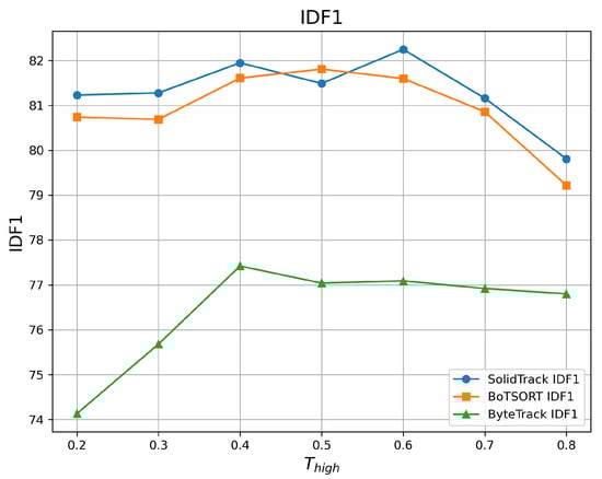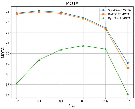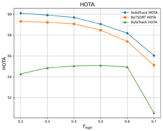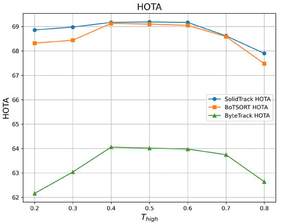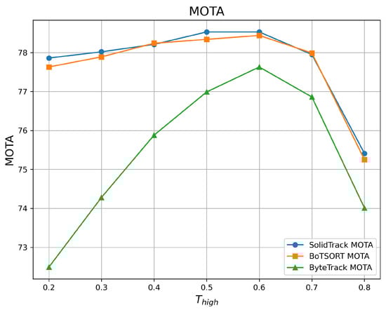 To evaluate robustness against varying detection score thresholds, we adjusted the detection score threshold () from 0.2 to 0.8 and compared the HOTA, MOTA, and IDF1 of SolidTrack with those of two SOTA methods. The results on the MOT17 validation set are provided in Table 1 and Figure 2, Figure 3 and Figure 4, while those on the MOT20 validation set are presented in Table 2 and Figure 5, Figure 6 and Figure 7.