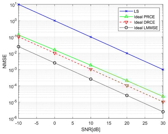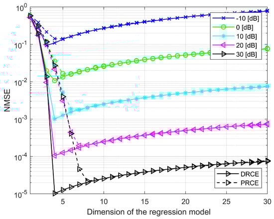 According to Figure 4 and Figure 6, DRCE improved the performance of regression–based CE by 26 dB in one tap channel and by 20 dB in four tap channels. Both regression–based CE schemes even showed the same performance as the ideal LMMSE on the one-tap channel. In contrast, PRCE demonstrated performance gains of 19 dB at low SNR (−10 dB) and 16.5 dB at high SNR (30 dB). In the four-tap channel, PRCE performs worse than DRCE due to inherent structural limitations, which result in the optimized regression dimension exceeding the number of channel taps by the amount shown in Table 2. Additionally, the reason PRCE’s performance towards that of DRCE at low SNR is that the reduction in residual noise is greater than the modeling error caused by the reduced dimension. These results demonstrate that the regression model effectively enhances CE performance and that the performance of each regression model varies depending on the specific channel condition.