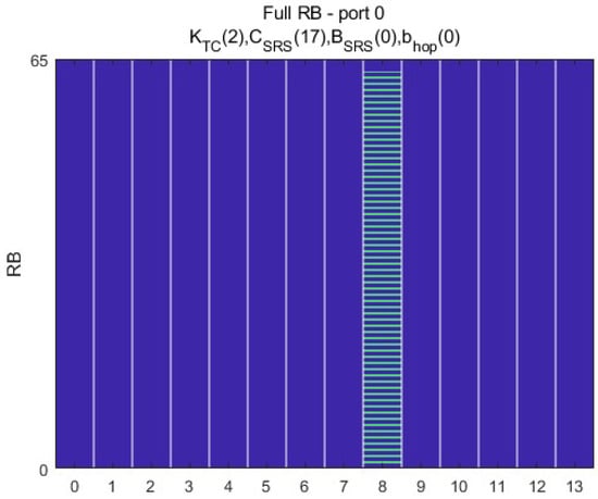 where and is a root sequence generated from a Zadoff–Chu sequence [25]. This sequence has constant amplitude and zero autocorrelation, allowing for orthogonal code multiplexing with a cyclic shift offset, . The indicates the SRS sequence length, with both and are determined by higher-layer parameters. After generating the sequence, it is normalized by the number of antennas and the amplitude scaling factor , then mapped to length subcarriers:
