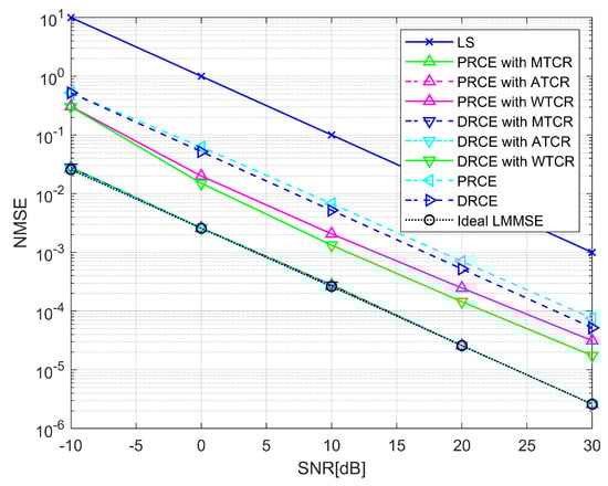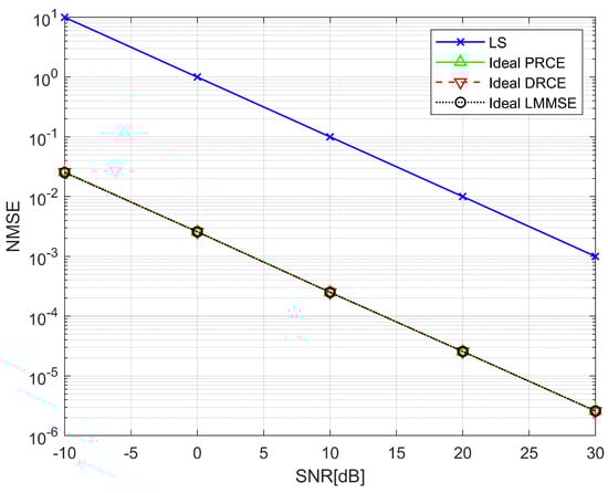 where and it has equal statistical property with . The LS estimator is popular for its low computational complexity. However, the feature that residual noise has the same statistical properties as the received signal makes it vulnerable to low SNR environments. The LMMSE estimator [28,29,30] has robust performance for SNR by leveraging statistical information such as noise distribution and channel correlation. The LMMSE estimator formula is represented as