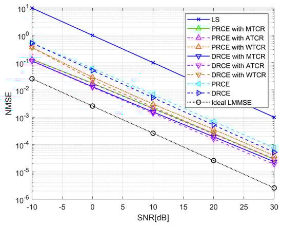 Each simulation was run a total of 100,000 times for SNR levels at 10 dB intervals from −10 dB to 30 dB. To determine the experimental marginal performance, LMMSE calculated the performance using the correlation matrix . This result is referred to as the ideal LMMSE because it cannot be achieved in real-world scenarios. We assumed that the maximum delay spread () is approximately 20 and that the delay spread remains relatively constant over time. For the WTCR, the total non-zero channel taps and channel length were set using the maximum delay spread. The noise-weight parameter was optimized for each SNR level and channel condition, selecting the best value from a range of 0 to 300 in steps of 10. In addition to WTCR, our scheme optimizes the threshold scaling parameter through Monte Carlo simulations conducted within the range of 0.05–7.0, using intervals of 0.05 for each multipath and SNR environment. All the simulations performed in this paper present the outcomes achieved by running 10,000 times. The NMSE is expressed by
