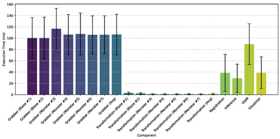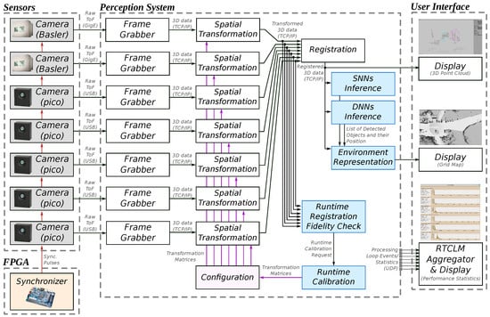 Figure 3 illustrates the overall software architecture of the proposed perception system. Every node represents a compage component, while intra-process communication is implemented using icom. The whole system (i.e., parameters, number and type of components, communication) can be configured using a simple .ini file. Here, frame grabbers receive data from different ToF sensor camera types. These nodes can be substituted with “fake” camera components that replay pre-recorded data for simulation and testing. Further, each 3D point cloud is processed separately using spatial transformation nodes. Transformed 3D data are further registered into a single-coordinate system while executing a runtime registration fidelity check. If the camera configuration has changed, the runtime calibration node attempts to calculate a new configuration for the transformations. Finally, the registered data are provided to conventional (CNN) and modern (SNN) inference nodes and an environment representation block, which converts 3D data into a grid map handoff for further collision avoidance and path-planning algorithms.