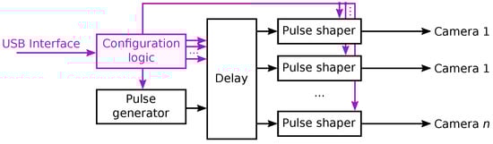 The triggering system providing the necessary flexibility, implemented in programmable logic to ensure consistent deterministic behavior, is shown in Figure 4. The black arrows represent the flow of the trigger signal, which starts at the pulse generator. A set of delay units offset the trigger pulse by different period for each of the cameras, thus allowing a precisely controlled simultaneous or staggered sensor acquisition. Pulse shapers are inserted after the delay units to ensure the necessary trigger pulse width. All of the parameters are adjustable within the software through the configuration interface to allow users to choose the desired frame rate and set the delay for a particular sensor family. The configuration interface, drawn in purple, consists of configuration registers containing the variables used by individual components and configuration logic to make the registers externally accessible through a specific interface. In this system, a USB interface was used.